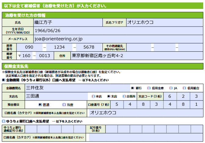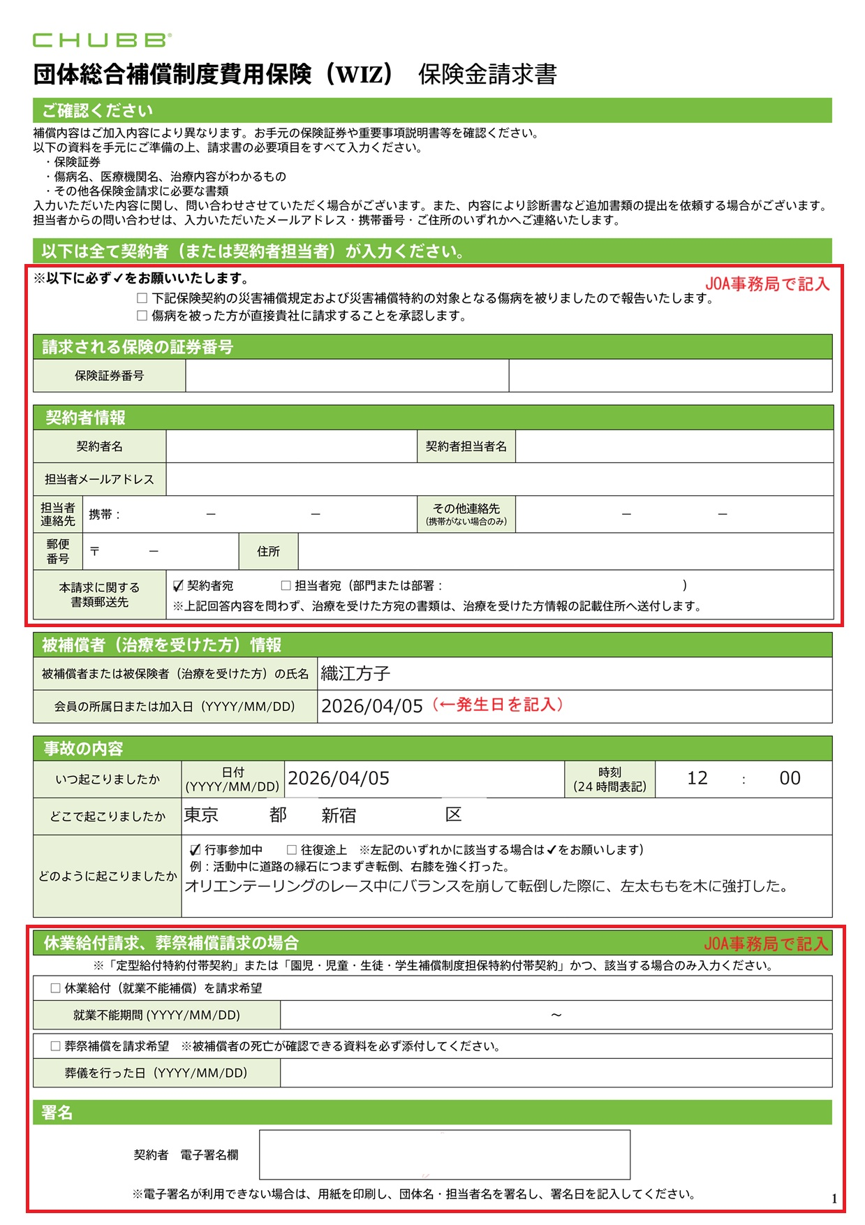 Chubb保険から手続きのメールが届いたら、下記の記入例を参考に、保険請求書に必要事項を記入し、JOA事務局へ送信する。